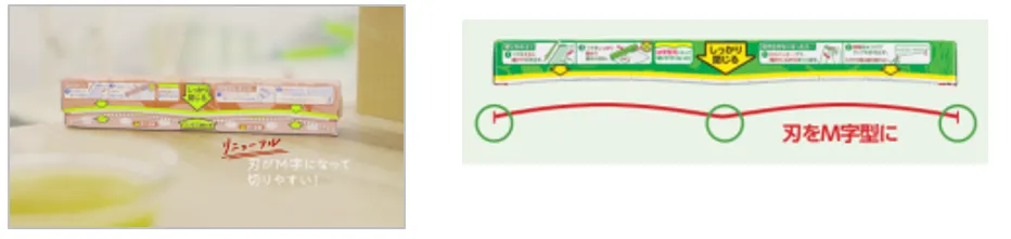 刃をM字にすることで、3か所の先端に力が集中するようになり、軽い力でフィルムを切りやすくなりました。