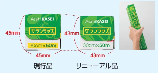 パッケージサイズが2mm細くなって握りやすくなり、パッケージの開け閉めをはじめとした様々な動作が行いやすくなりました。(30cm×50mの場合、45mmから43mmに2mm細くなっています。)