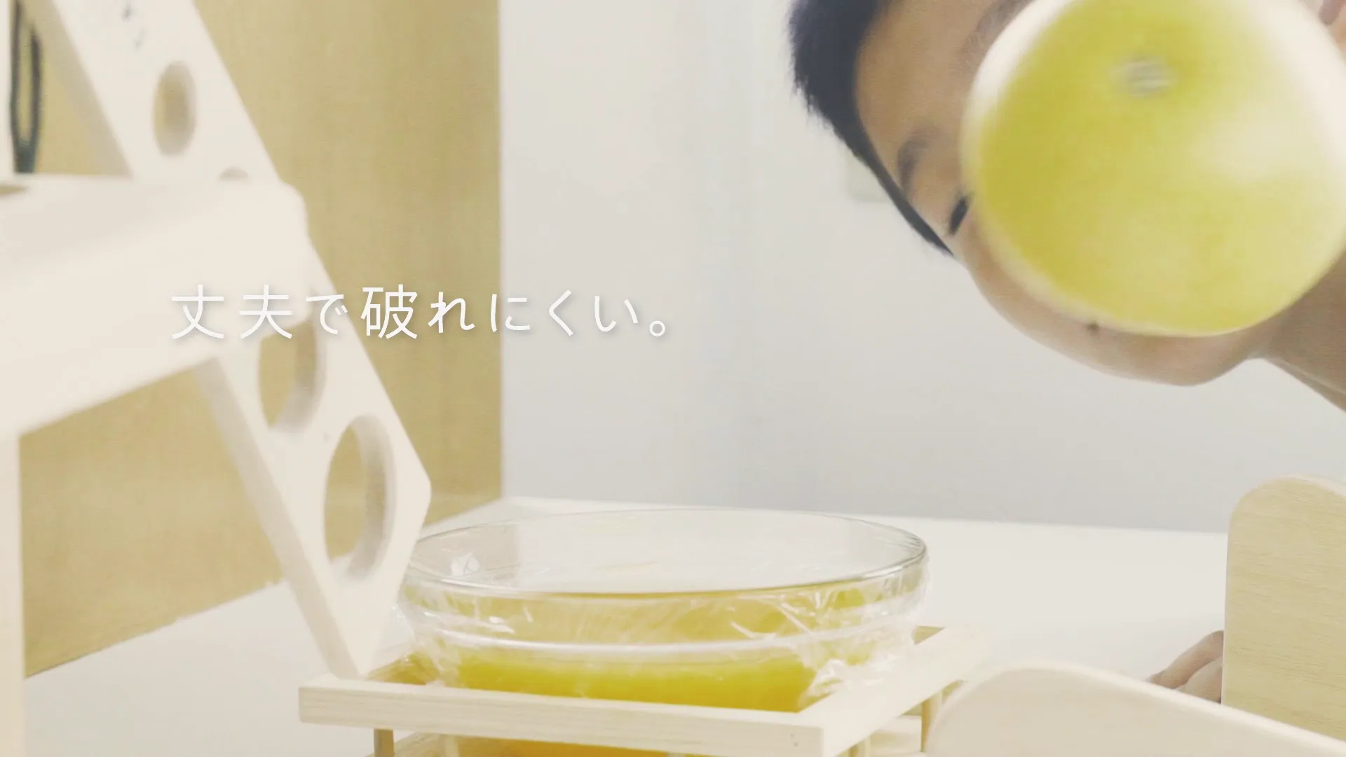 行きついた先には、大きなグレープフルーツが。そのグレープフルーツがサランラップ(R)で蓋をしたボウルに落下しますが、ハリ、コシがあって丈夫なサランラップ(R)はビクともせず、グレープフルーツは跳ね返って転がります。