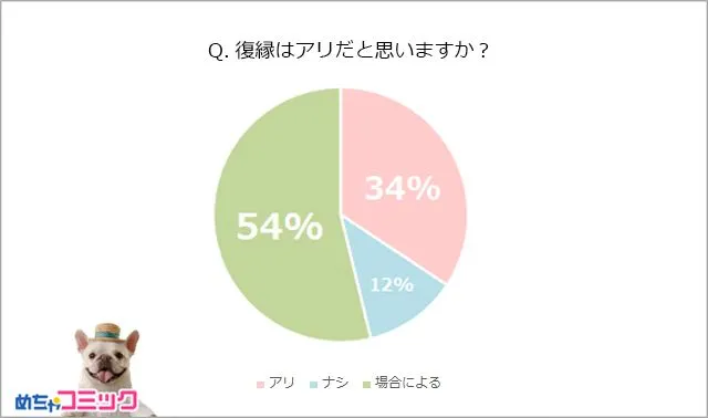 「場合による」と答えた人が半数を占めました。別れ方は人さまざまなので、各カップルの事情による、とのことです。「場合による」と答えた人の他、「復縁はアリ」「復縁はナシ」と答えたそれぞれの意見を聞いてみましょう!