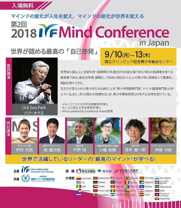 特定非営利活動法人 国際青少年連合(IYF)は、世界で活躍している様々な各界リーダーを迎え、最高のマインドとは何かを学ぶことができるイベント「IYF MIND CONFERENCE in JAPAN 2018」を、2018年9月10日(月)~9月13日(木)に東京代々木・国立オリンピック記念青少年総合センターにて開催いたします。