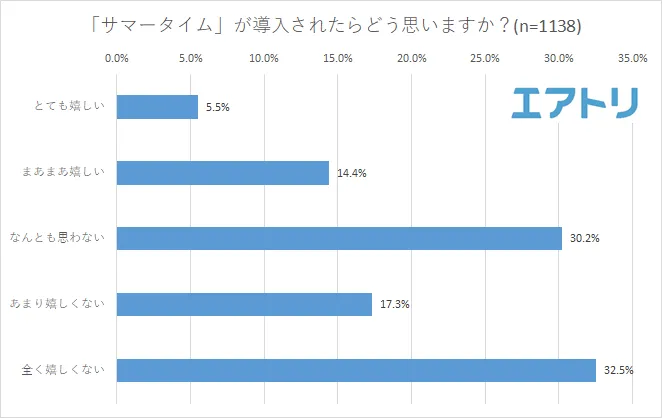 サマータイムが導入されたらどう思うか聞いたところ、最も回答が多かったのは「全く嬉しくない(32.5%)」でした。一方で、「とても嬉しい(5.5%)」と「まあまあ嬉しい(14.%)」の「嬉しい」と考えている人が約5人に1人いることが分かりました。