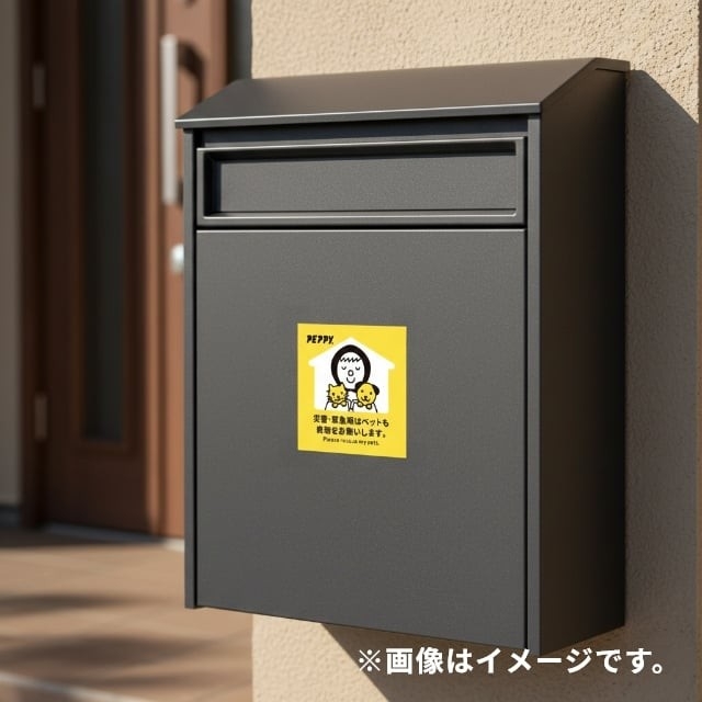 「わんにゃん防災ステッカー」は、玄関・ポスト・宅配BOXなど人目につきやすい場所への掲出を想定した防災アイテムです。