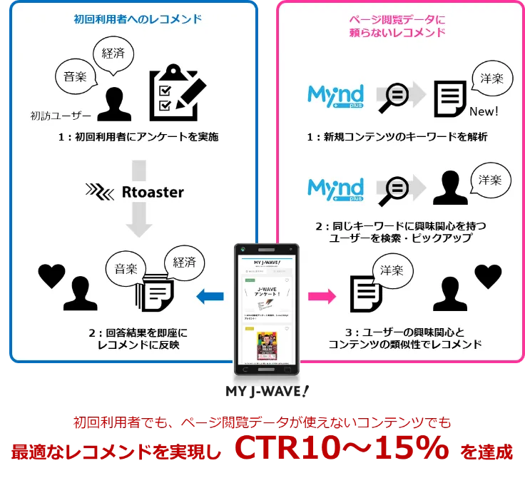 「Rtoaster」はJ-WAVEのリスナーに新しい音楽や番組、パーソナリティーとの出会いを創出し、ラジオを身近に感じてもらうための先進的なデータドリブンマーケティングの実現に活用されています。