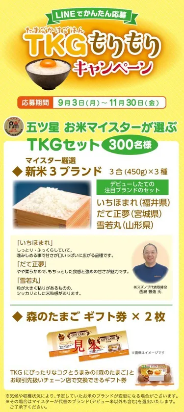 LINEで簡単応募!9月3日(月)~11月30日(金)の期間、 「たまごかけごはんTKGもりもりキャンペーン」を実施