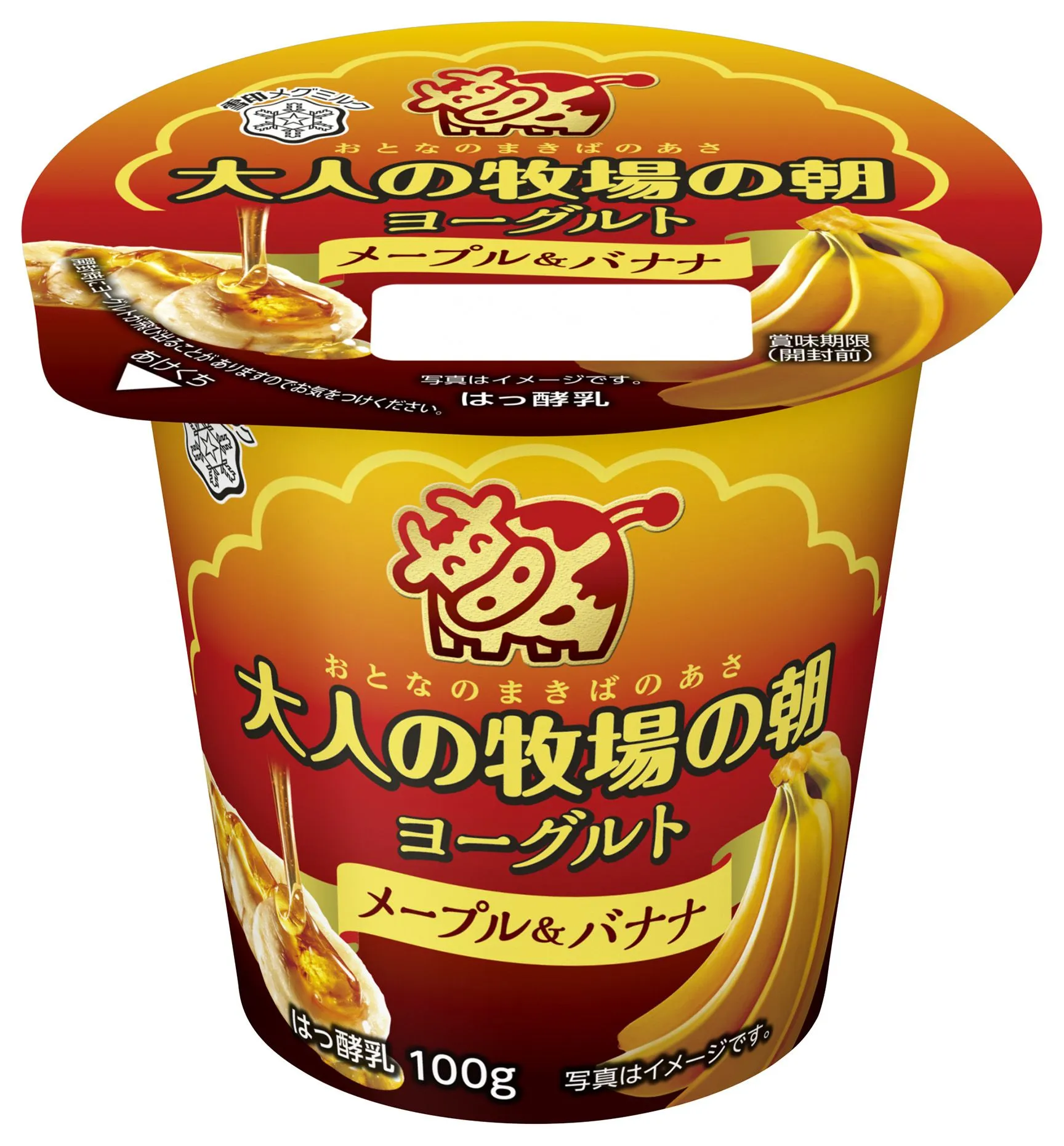 『大人の牧場の朝 メープル&バナナ』は、熟したバナナ果肉とメープルの組合せが贅沢なひとときを演出します。フランベしたバナナのような上質感のある大人向けの風味です。