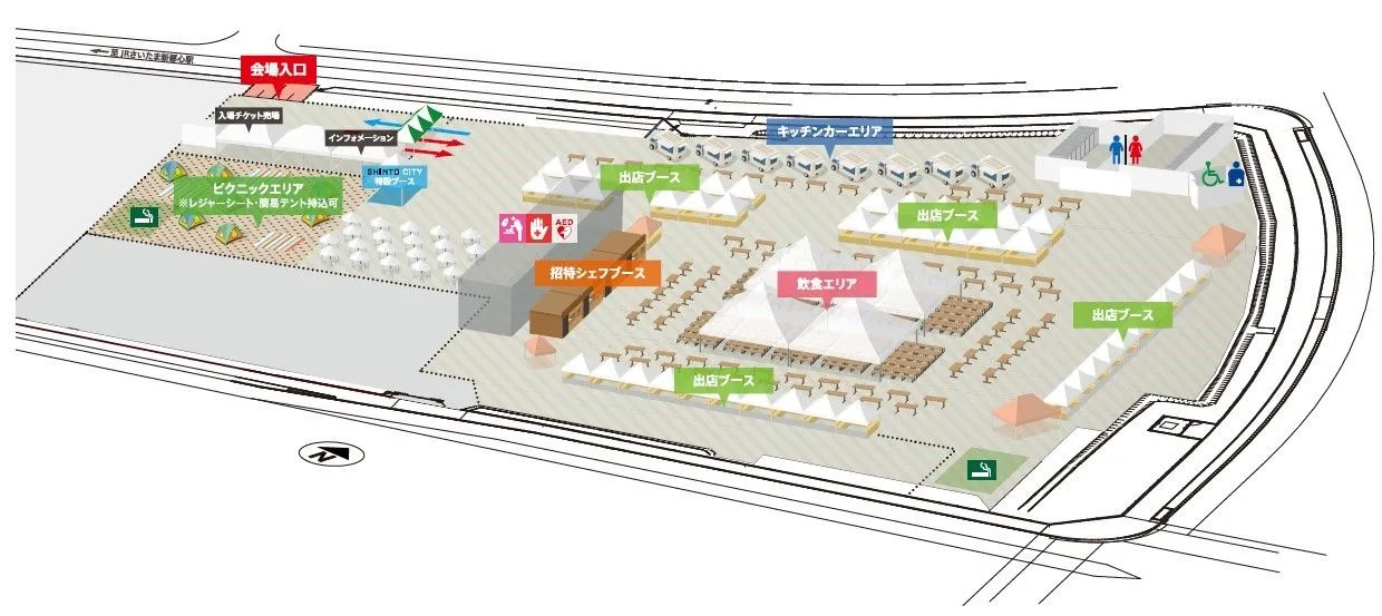SHINTO CITY建設予定地の広大な敷地を生かしてダイナミックに開催いたします。広々とした野外でお酒や料理を楽しめ、老若男女幅広い方々にとって、シルバーウィークのお出かけにぴったりなイベントとなる見込みです。