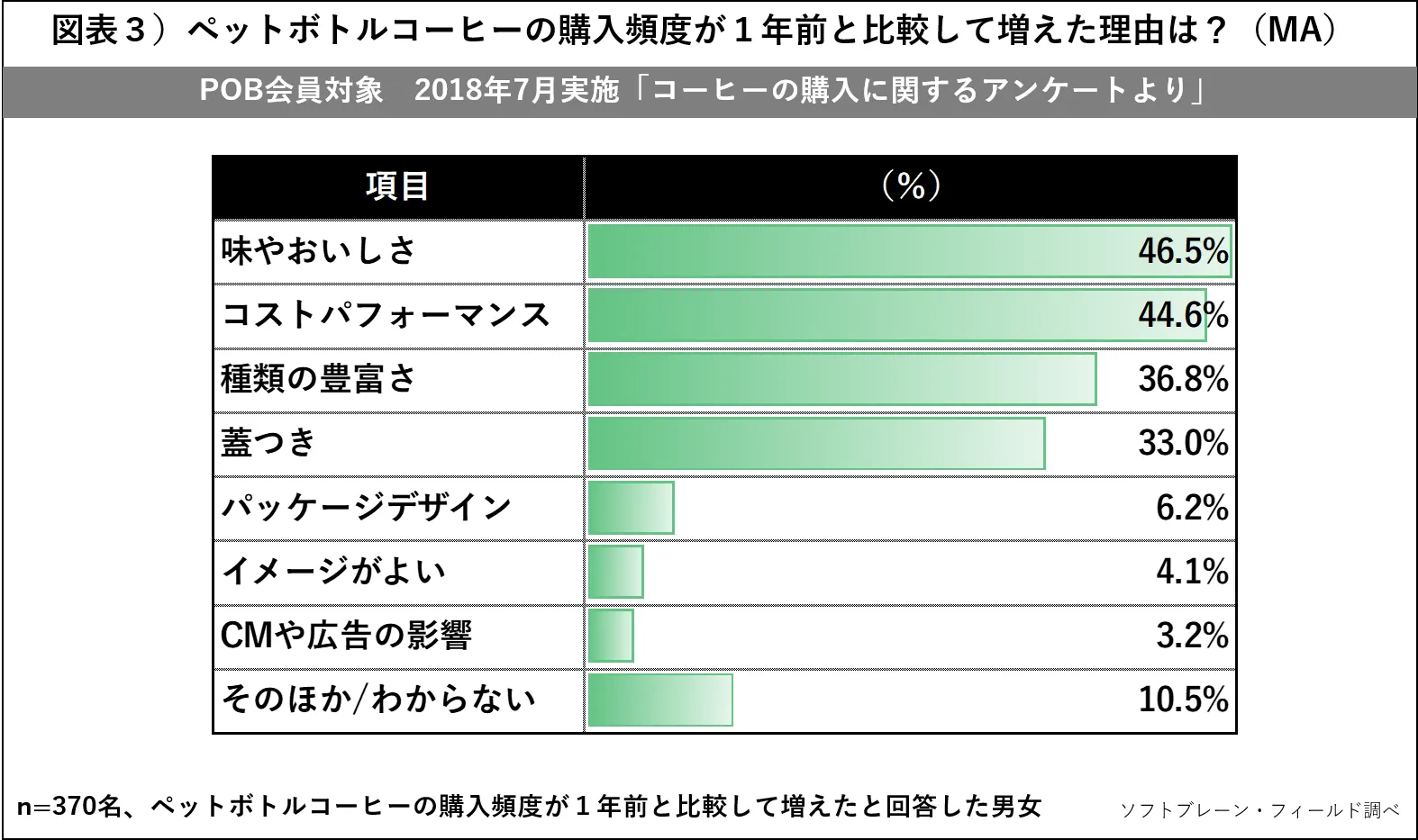 種類も豊富なペットボトルコーヒー。消費者の購入頻度は変化したのでしょうか。普段ペットボトルコーヒーをもっともよく購入すると回答した801名のうち、1年前と比較して購入頻度が高くなったと回答した方は、370名でした。その方々を対象に、理由について調査をしました。