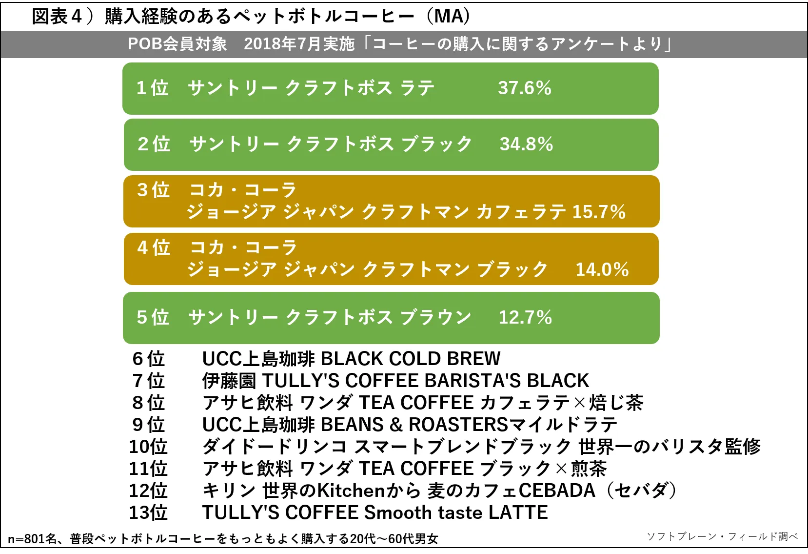 次に、代表的なペットボトルコーヒーの銘柄13種をピックアップし、購入経験について調査をしました。