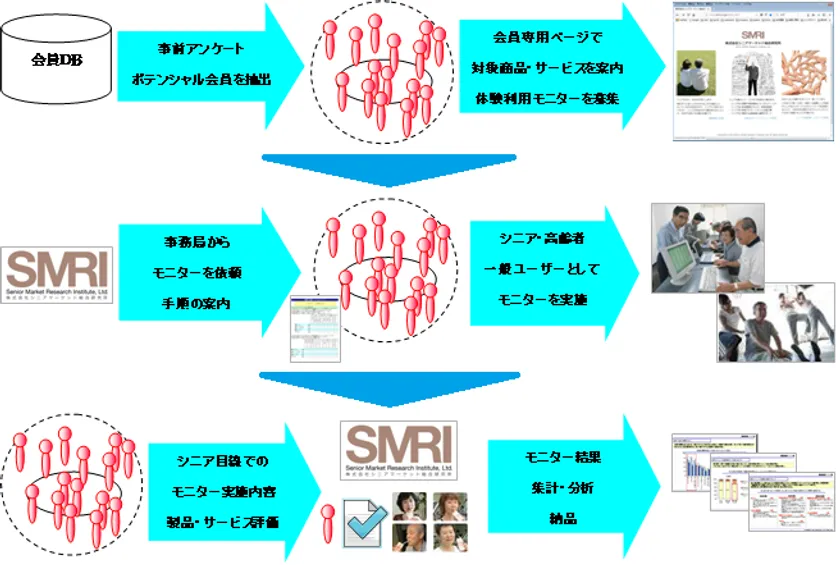 基本的な流れとしては5ステップでシニア・高齢者によるモニター業務を実施します。