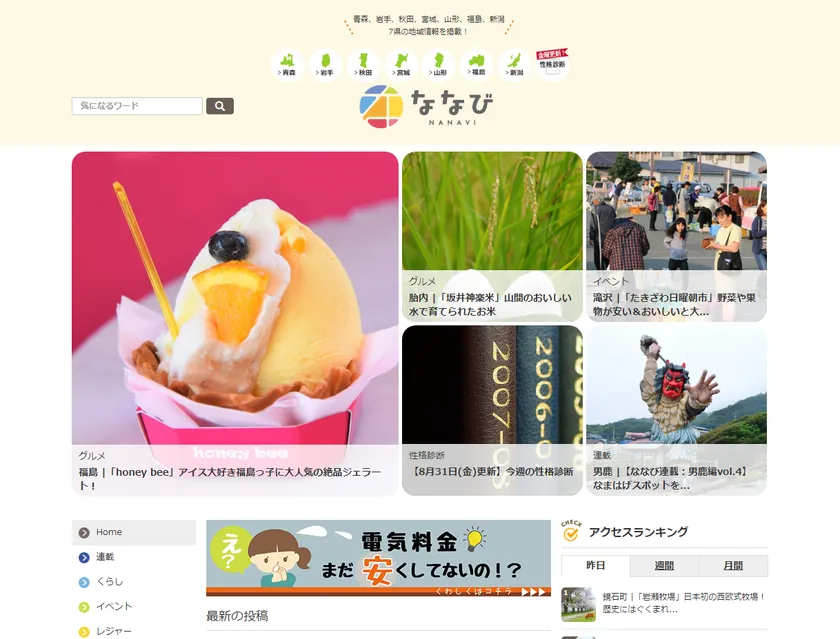 企業のコンテンツ企画・制作を支援する株式会社ライトアップ(本社:東京都渋谷区、代表取締役社長 白石崇)は、青森県・岩手県・秋田県・宮城県・山形県・福島県・新潟県、合計7県の情報を発信する地域密着型情報サイト「ななび」にて、夏休みも終わり、少しずつ秋の気配が感じられる各県の注目情報を詰め込んだ新たなコンテンツを更新いたしました。