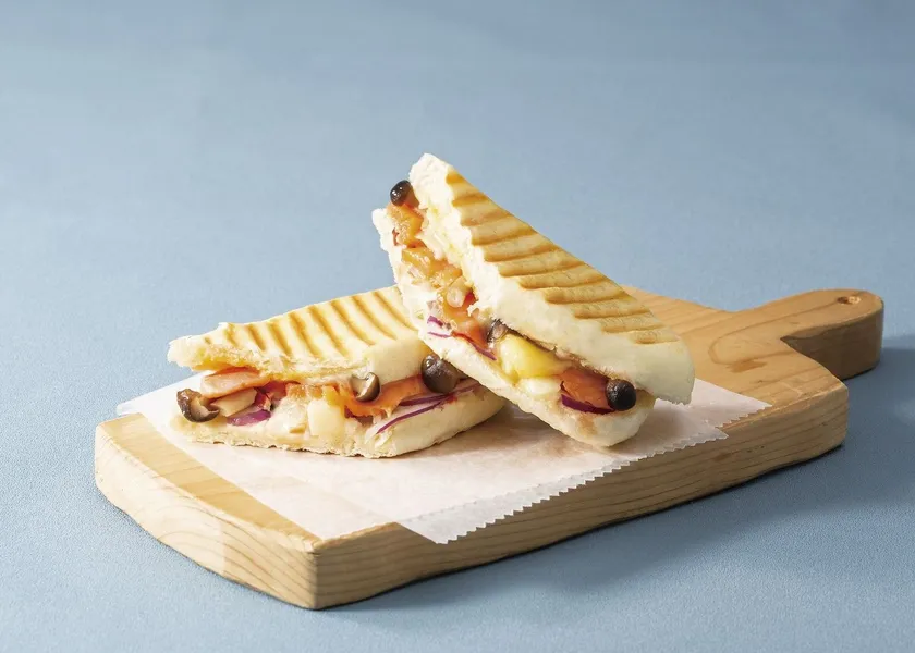 たっぷりのスモークサーモンときのこをグラタン風のソースと共に挟み込み、プレスをしながら丁寧に焼き上げました。こんがり焼き目のついた外側のパンのサクッとした食感と、中の具材とのコントラストを熱々のままお楽しみいただける、商品開発チームの一押しです。