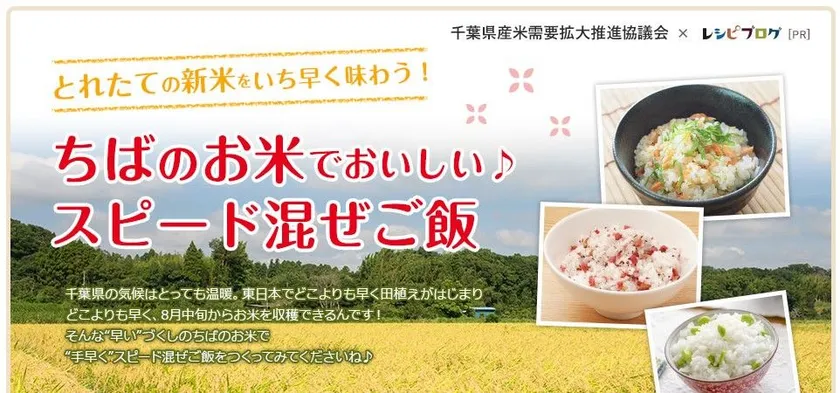東日本でどこよりも早く田植えが始まり、どこよりも早くお米を収穫できる、「早い」づくしの千葉のお米。今回はレシピブログに登録している千葉県在住のお料理ブロガー20名に「千葉県産コシヒカリ5合」をモニタープレゼントし、各自のブログでレシピ投稿テーマの“「手早く」スピード混ぜご飯”のレシピや千葉県の新米の魅力を紹介していただきます。併せて「千葉県産米2合」のプレゼントキャンペーンを実施します。