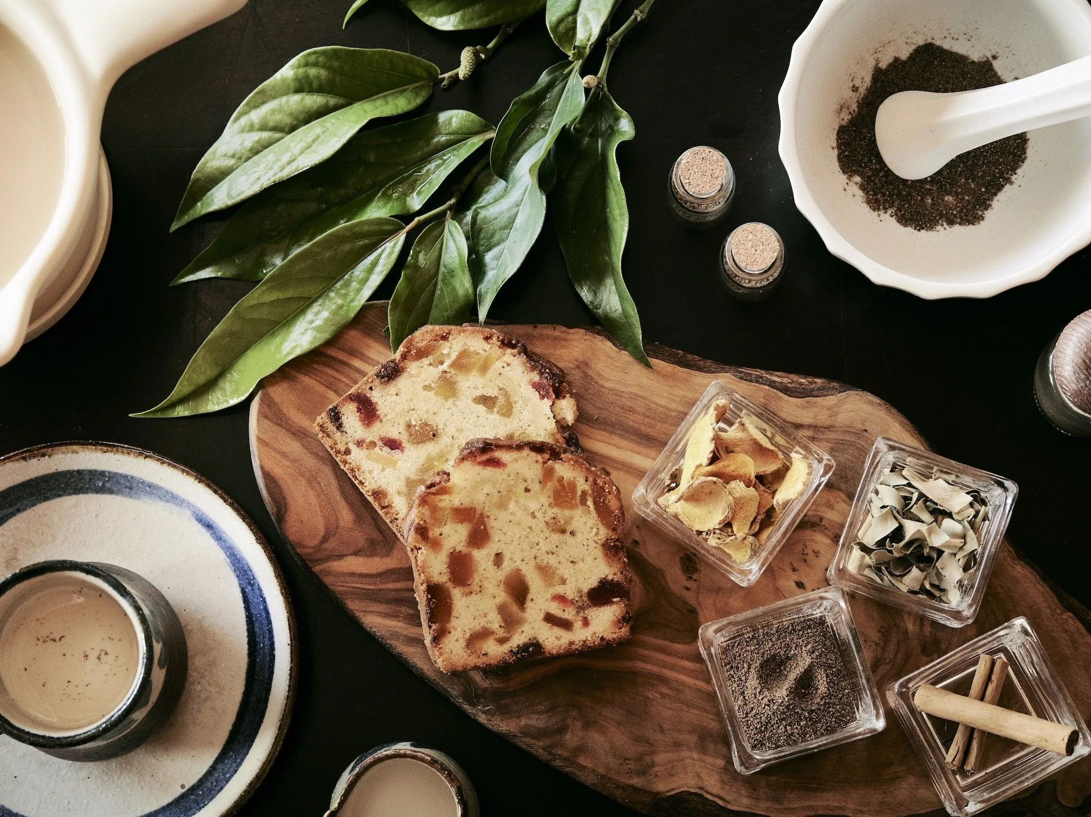 ピーヤシや月桃、ウコンなど、島で親しまれているスパイスがたっぷり入ったチャイです。パティシエのレシピを見ながら、ご自身でスパイスを調合し、茶葉と牛乳で煮出します。ふつふつしてきたときに広がるピーヤシの香りとチャイの優しい甘味で心も身体もほっこり温まります。