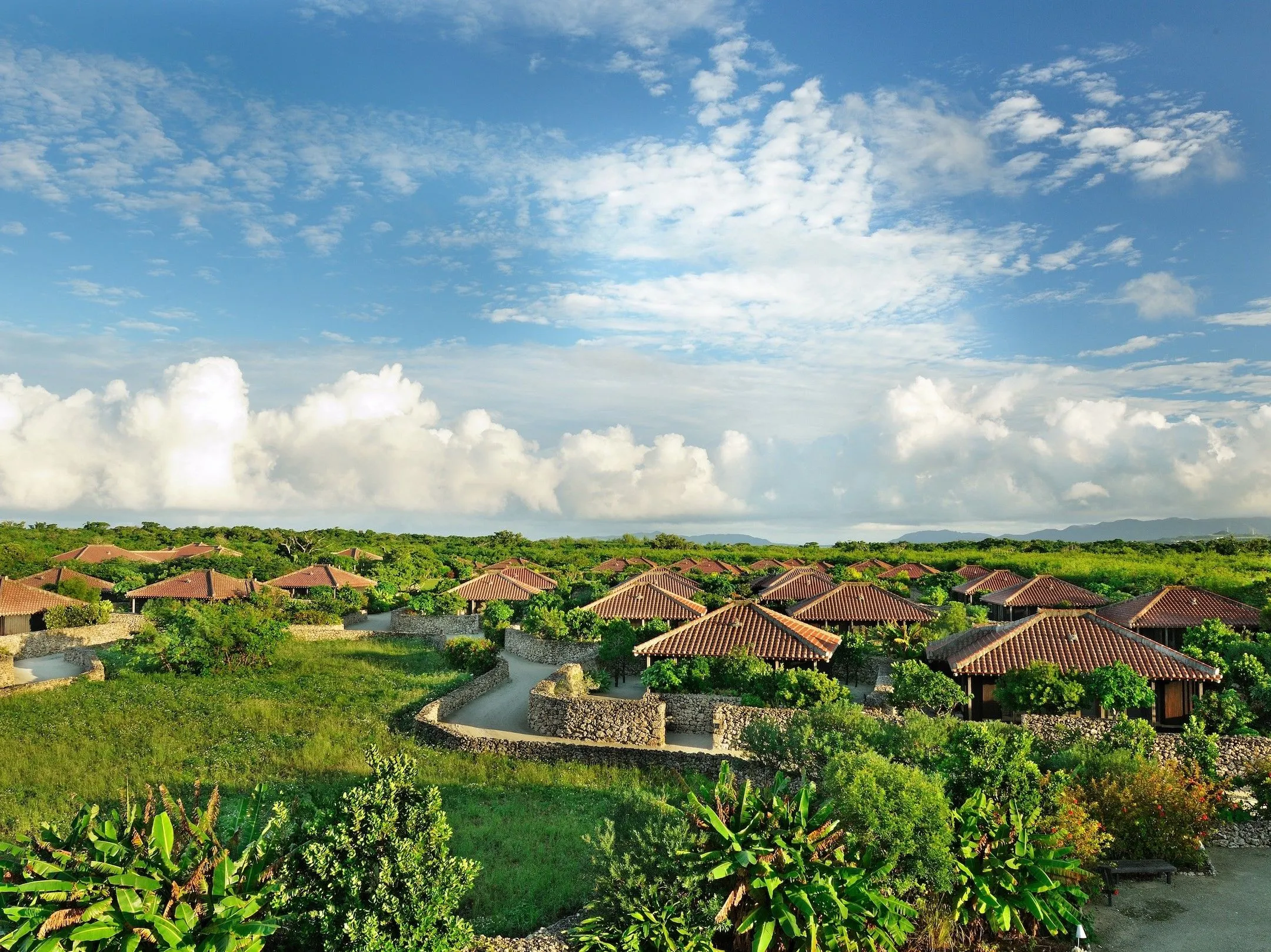 竹富島の東に位置する琉球赤瓦の集落「星のや竹富島」。約2万坪の敷地には、島内の家々と同じように「竹富島景観形成マニュアル」に従い、伝統を尊重して建てた戸建の客室、白砂の路地、プール、見晴台などがあり、小さな集落が構成されています。