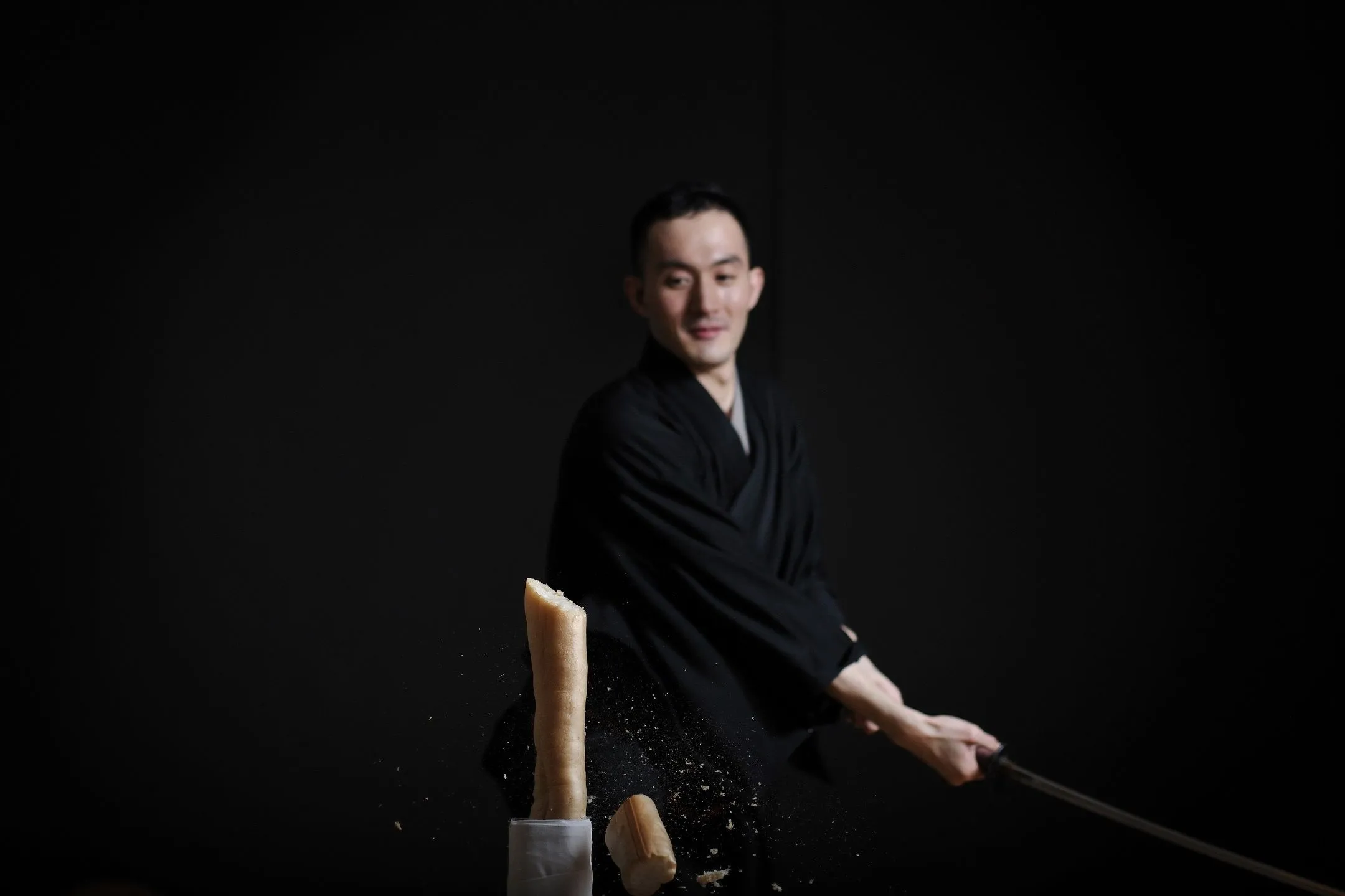 稽古の最後には「試斬麸(しざんふ)」と呼ばれる麸を使った試し斬りを行います。一発勝負という緊張感を感じながら、稽古で培った集中力や精神力を最大限に発揮し、試斬麩に向き合います。初日の練習では空振りしてしまったり、割れてしまったりと、思い通りに斬ることのできなかった試斬麸が、翌日の本番ではうまく斬れるようになることで、爽快感や達成感とともに、自身の成長を実感できます。