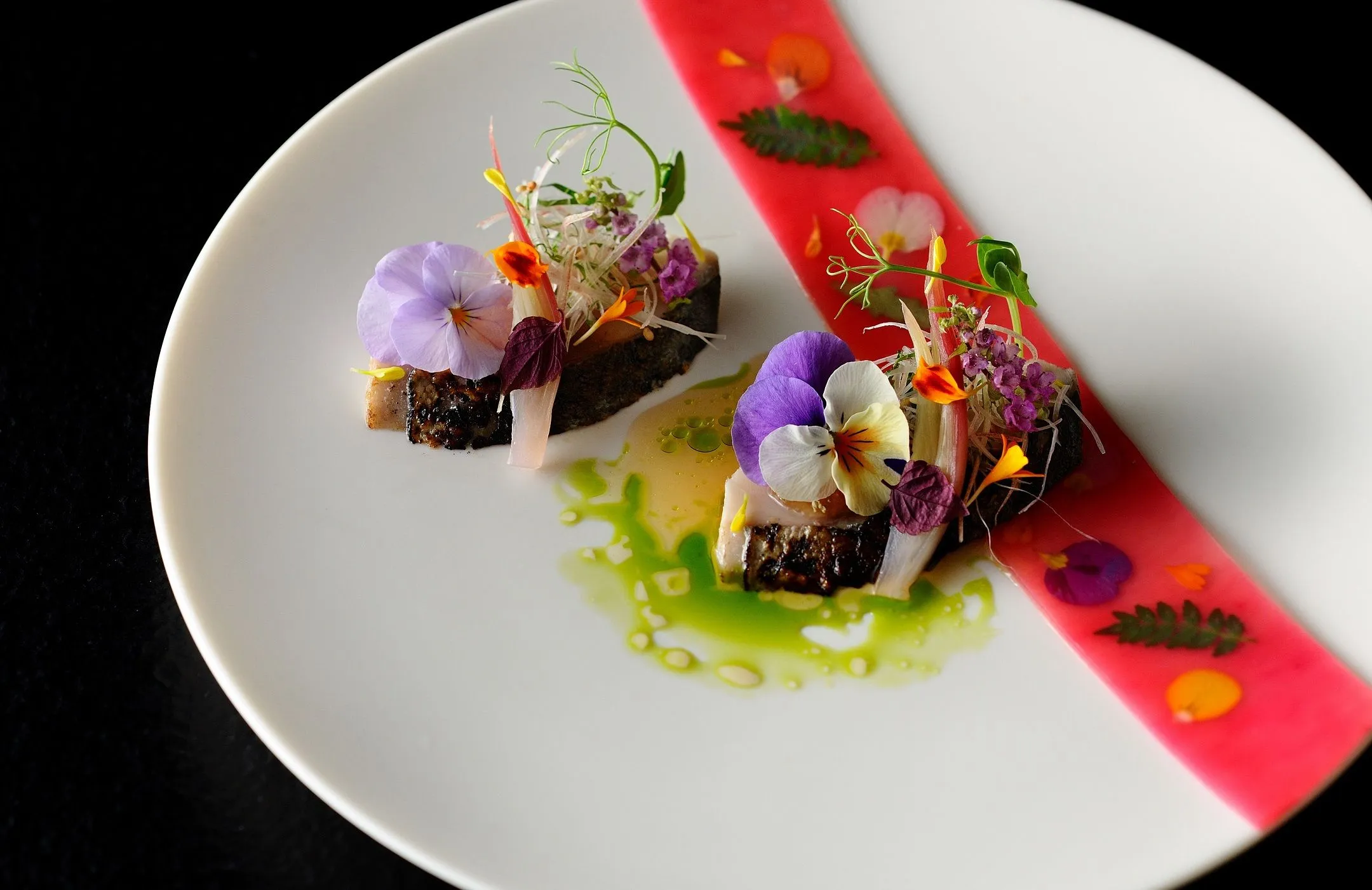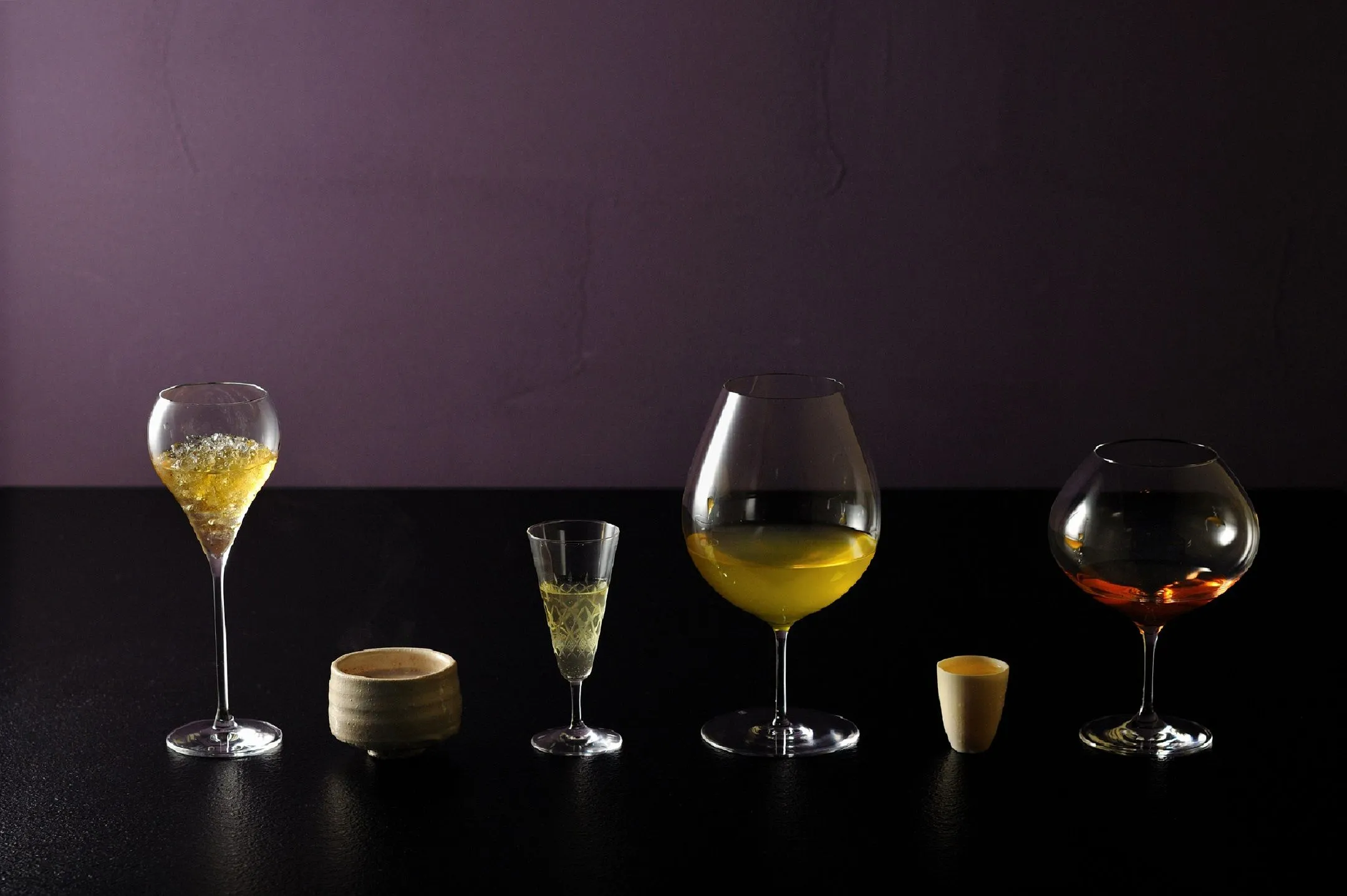 夕食は、日本の食文化を支えてきた魚を中心に、日本の豊かな自然から生み出される季節の食材とフレンチの技法をかけ合わせたフルコース「Nipponキュイジーヌ」です。江戸に住む上流階級の武士の間ではお茶の味や香りの違いを見極めて品種や産地を当てる「闘茶(とうちゃ)」と呼ばれる遊びが盛んに行われていました。そこから発想を得て、星のや東京としては初めて、料理に合わせたお茶のペアリングを提供します。ペアリングに使う茶葉は、茶葉そのものの個性を感じられるよう、合組(ブレンド)したものではなくすべて単一品種です。日本に約50種類以上ある品種の中から、料理に合う茶葉を厳選して提供します。さらに、茶葉だけでなく、水出し、熱湯出しなど淹れ方も変えることにより、お茶の持つ個性豊かな風味を料理とともに楽しむことができます。