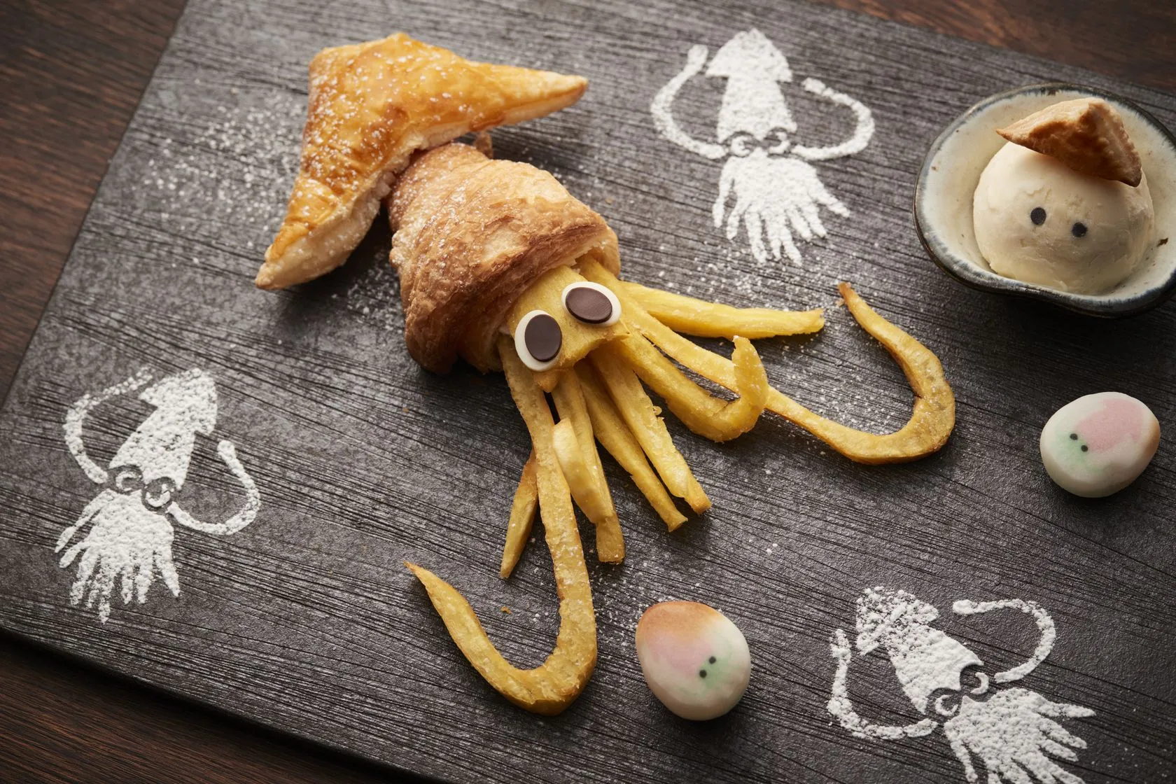 イカコロネは、幅広い世代に親しまれる昔懐かしいコロネの形を活かし考案しました。イカの耳をパイ、イカの足を揚げたさつまいも、胴体をりんごカスタードクリームが入ったコロネで表現しています。サクサクとしたパイやさつまいもをアイスクリームに付けて食べるのがおすすめです。