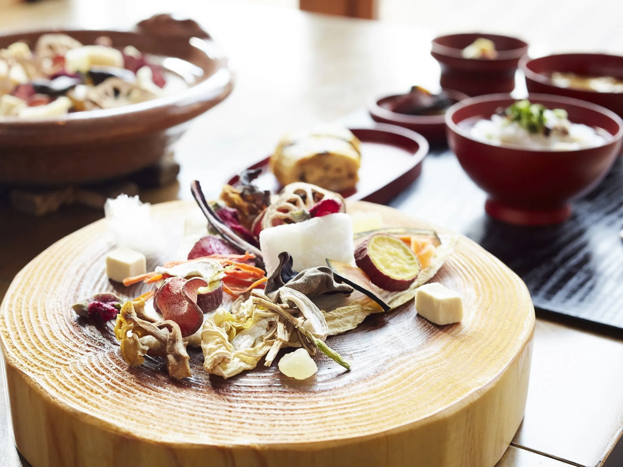星のや軽井沢のメインダイニング「日本料理嘉助」では、信州の保存食を使用した特別朝食を提供します。「寒干し大根」の炊き合わせや、干し野菜の旨みと食感が特徴の、焼きたての出汁巻き卵などが膳に並びます。また、冬の寒さを生かして作る伝統食「凍り餅」と米を、約10種類の干し野菜・干しきのこの出汁で炊き上げた「餅かゆ」を主食として楽しめます。