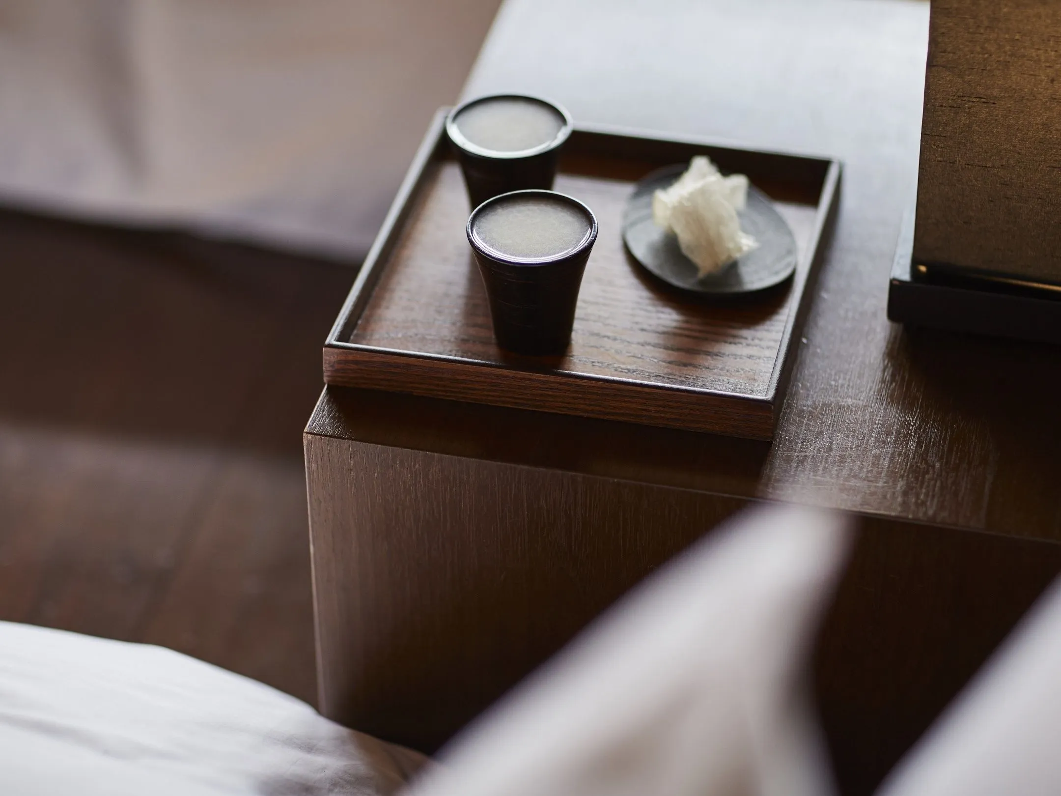 冬の早朝、軽井沢の外気温はマイナスになります。目覚めのドリンクとして、寒天を溶かした温かい甘酒をスタッフが客室に届けます。目覚めに温かい飲み物を飲むことにより、身体の中から温まります。