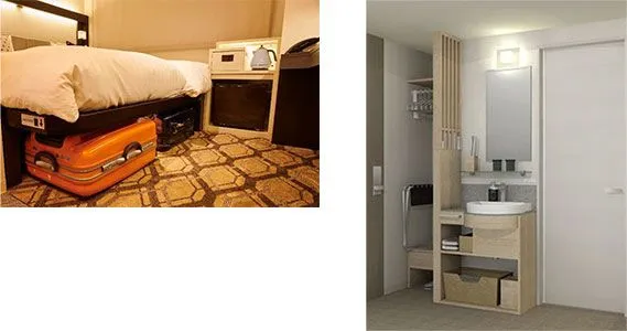 客室数全254室のうち、約7割を占める15平方メートルのコンパクトなお部屋は、ベッド下にスーツケースを収納できるスペースやアウトベイシンスタイル(※)を採用。ベッドスペースを広く確保することで快適にお過ごしいただけるような造りとなっています。他にも客室内サインにピクトグラムを用いるなど、直感的に客室のどこに何があるかわかるように工夫しています。