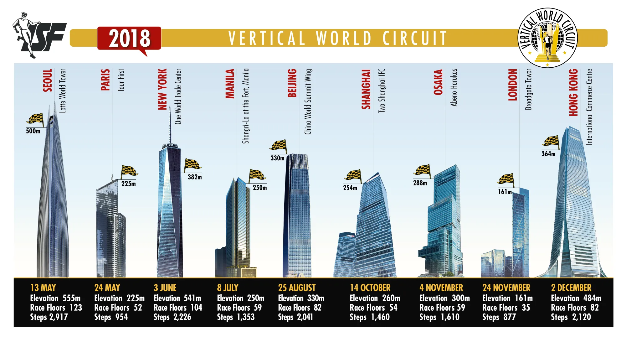 「2018 Vertical World Circuit」とは、 超高層ビルの頂上を目指して階段を駆け上がるタイムトライアル形式のマラソンレース。