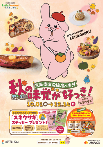 今回は、「秋の味覚」をテーマに、旬の食材を使ったグルメやスイーツを楽しめる両沿線の飲食店をご紹介する企画「京阪・南海沿線食べ歩き!秋の味覚が好っき!withスキウサギ」を開催します。