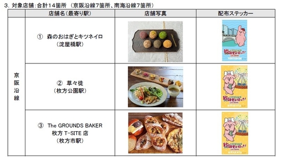 さらに本企画では、ご紹介する京阪・南海各沿線の飲食店全14店舗で特設WEBページを提示していただくと、漫画家・キューライス氏のオリジナルキャラクター「スキウサギ」と京阪・南海沿線にちなんだモチーフが描かれた、キューライス氏描きおろしの京阪・南海ええとこどり限定ステッカー(全8種類)をプレゼントします。