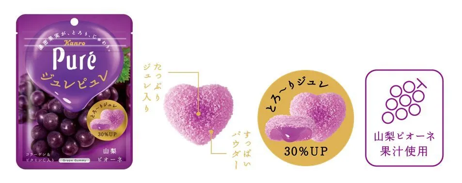 特徴 : センターのジュレを30%※アップし、濃密果実のとろり、じゅわりとした食感が楽しめるピュレグミ。こだわりの山梨ピオーネ果汁を贅沢に配合。