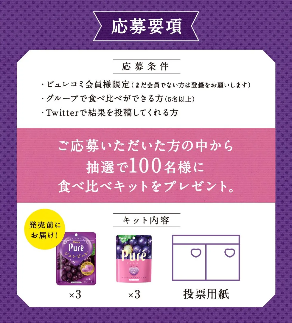 応募方法 | [ STEP1 ] カンロコミュニティ「ピュレコミ」にログインもしくは、 会員登録https://www.kanro.jp/kanro/pure/ [ STEP2 ] 応募フォームに食べ比べ実施可能人数、と意気込み、 その他必要事項を記入して応募 |