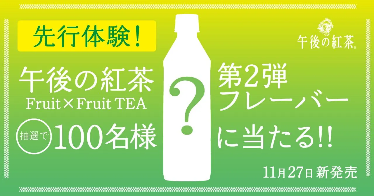 また、癒された動画の結果をツイッター上でシェアしてくれた方の中から、抽選で100名様に、「午後の紅茶 Fruit×Fruit TEA」シリーズ第2弾、新フレーバーの先行体験をプレゼント!誰よりも早く午後の紅茶の新商品を体験することができます。