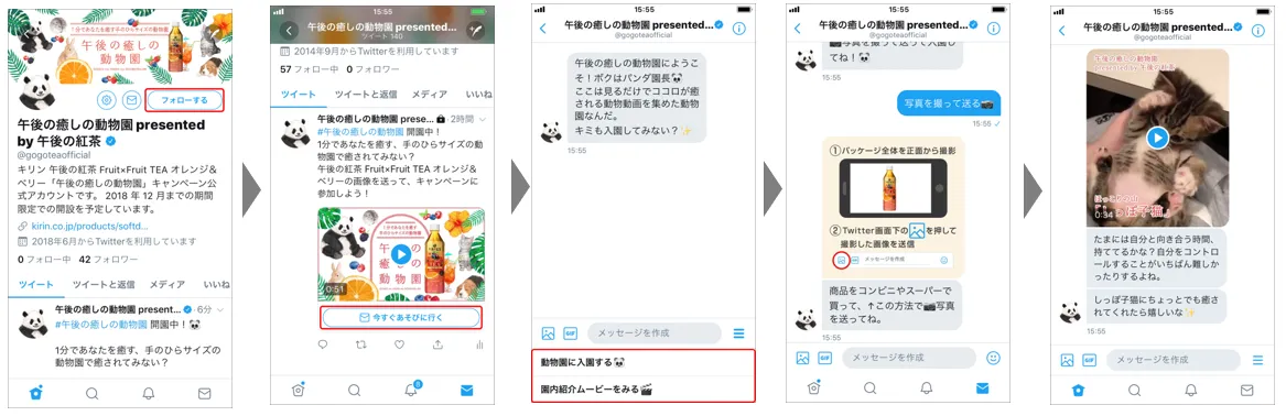 本キャンペーンは、9月18日(火)より新発売となる「午後の紅茶 Fruit×Fruit TEA オレンジ&ベリー」の発売を記念し実施いたします。新商品の“上質気分転換フルーツティー”というコンセプトに合わせ、仕事や家事の合間の息抜きに上質な癒しを提供してくれる、かわいい動物動画をご用意しました。キリンビバレッジ史上初のAI技術を駆使した、Twitterのチャットボットを活用したキャンペーン施策となっており、スマートフォン上で会話をすると、動物たちから、その時の気持ちにぴったりの癒しの動画と人生の教訓が届きます。