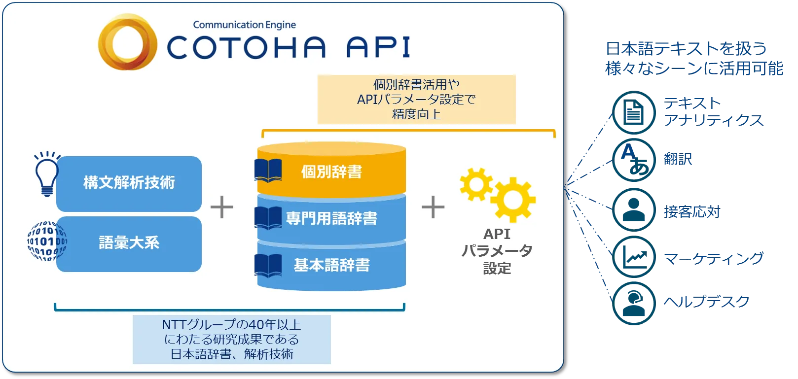 NTTグループ独自の高度な日本語構文解析技術と、単語を3,000種の意味属性に分類できる日本語語彙大系を基礎技術として活用しており、単語の意味を正確に捉え、文脈に応じて変化する言葉の意味も理解することが可能です。