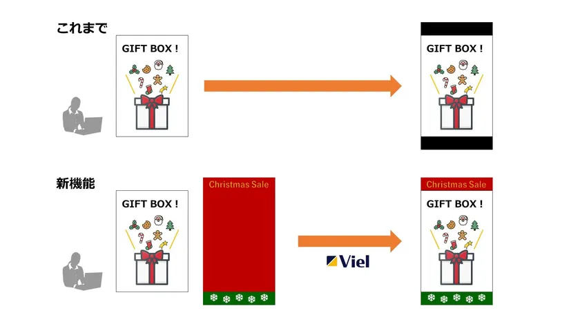 この度Vielでは、予め利用者側で自由に設定できる背景とポスターデータとを自動で合成することで、黒味の表示を回避。リサイズ、デザインやり直しの手間やコストの削減にお役立ちできるようになりました。