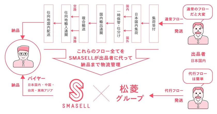 物流支援は、商業貨物の取扱いを得意とする松菱グループと連携し、物流センターと輸送ネットワークを活用したメーカーの国内倉庫への引き取りから通関、海外への輸送まで一気通貫のロジティクス サービスの提供により、パッキングリスト(P/L)・インボイス(I/V)・ビルオブレイディング(B/L)の作成といった輸送時に必要となる書類の作成が一切不要に、また、船や飛行機といった複合輸送により物量によって最適な見積もりを行うことも可能となり、スマセルユーザーへの手間を削減することで海外販路開拓の障壁をより一層和らげ、サイト上での取引を活性化します。
