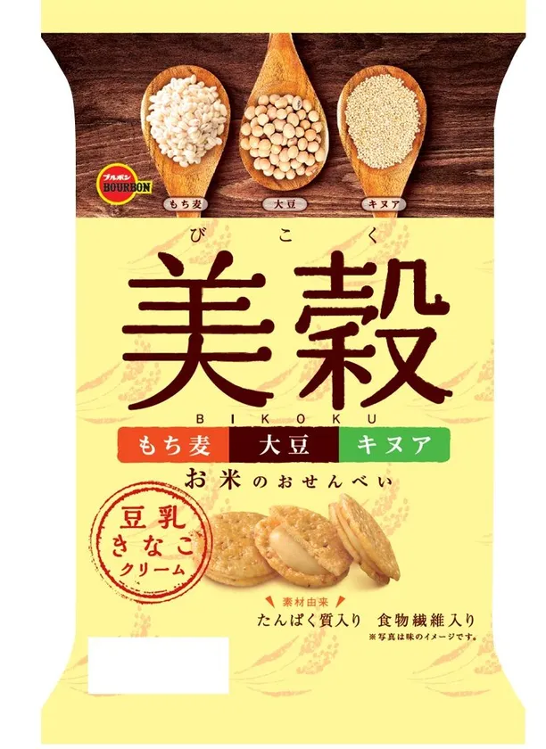 「美穀」は、生地に大豆、もち麦、ローストキヌアを練り込んだお米のおせんべいで、豆乳ときなこを使用したなめらかでコクのあるクリームをサンドしました。あっさりとした醤油味に仕上げ、雑穀の香ばしさを引き立てました。体にうれしい雑穀を美味しく手軽にお召し上がりいただけます。