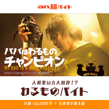総合人材サービス、パーソルグループのパーソルキャリア株式会社(旧社名:インテリジェンス、本社:東京都千代田区、代表取締役社長:峯尾太郎)が運営するアルバイト求人情報サービス「an」< https://weban.jp/ >は、思わず挑戦してみたくなるような「an超バイト」の新企画として、9月21日(金)公開の映画『パパはわるものチャンピオン』の舞台挨拶イベントで、悪役レスラー風覆面をつけてイベント進行のお手伝いをしていただく“わるものバイト”を2名募集します。報酬として、日給5万円。さらに、キャストサイン入りグッズが贈呈されます!また、全国どこからでも交通費は全額支給されます。