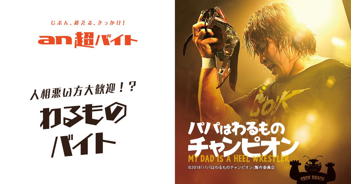 大人気絵本が、“新日本プロレス100年に一人の逸材”エース・棚橋弘至さんや人気女優の木村佳乃さんなど、夢の豪華キャストにより実写化された映画『パパはわるものチャンピオン』が、「an超バイト」とスペシャルコラボ!舞台挨拶イベントで、悪役レスラー風覆面をしていただいて、イベント進行のお手伝いをしていただく“わるものバイト”を募集します。