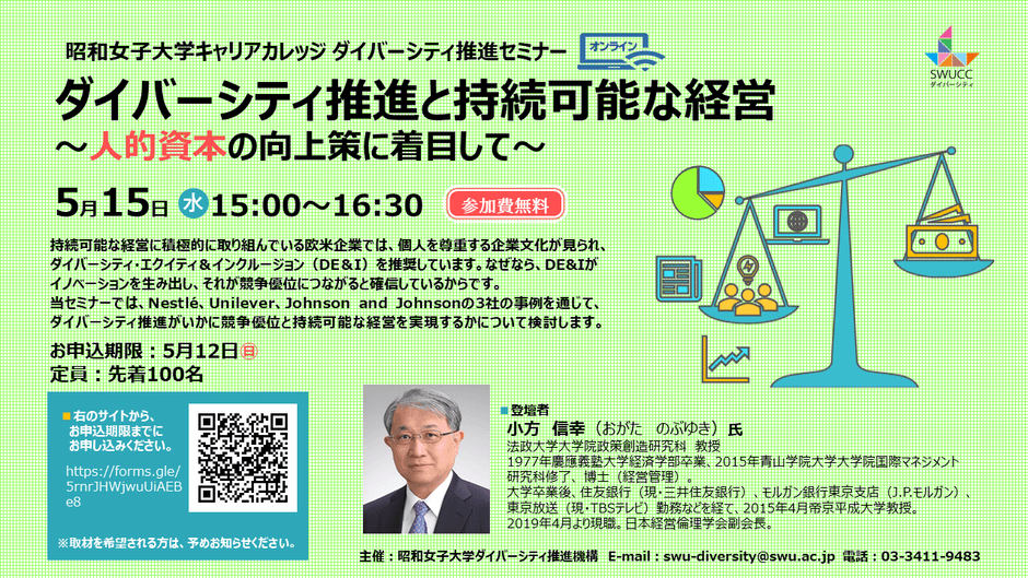 昭和女子大学 (学長 金尾朗:東京都世田谷区) のダイバーシティ推進機構が運営するキャリアカレッジでは、5月15日、ダイバーシティ推進セミナー「ダイバーシティ推進と持続可能な経営~人的資本の向上策に着目して~」(参加費無料)を開催します。
