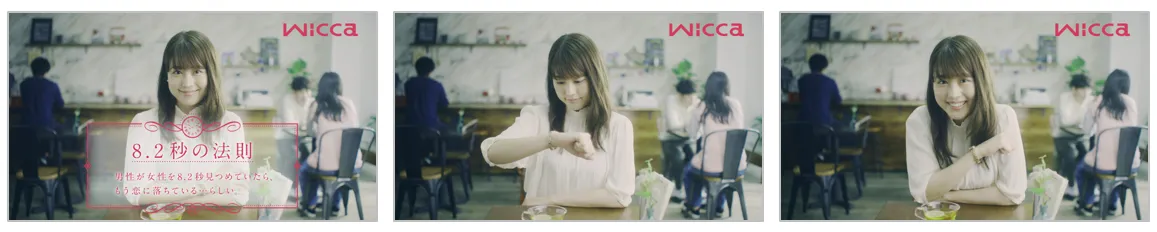 本動画は、最新かわいいウオッチ「wicca(ウィッカ)」のイメージキャラクター・有村架純さんを、8.2秒間、見つめることができる動画です。「男性が女性を8.2秒見つめていたら、もう恋に落ちている」という、「8.2秒の法則」に基づいた、シンプルな構成となっており、見終わったら、絶対に有村さんに惚れてしまいます。