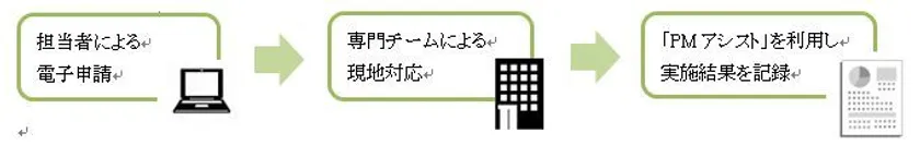 各マンションの担当者から電子申請による依頼を受け専門チームにて対応後、「PMアシスト」を利用し、実施結果を写真とあわせて記録しています。