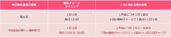 「毎日無料連載」は、昼12時を過ぎると無料チャージを利用し、作品毎に1話ずつ無料でお楽しみいただけますが、今回追加した新形式では、朝7時と夜19時を過ぎると作品毎に最大4話ずつ無料でお楽しみいただけます。※1回で読める無料話数は作品によって異なります。
