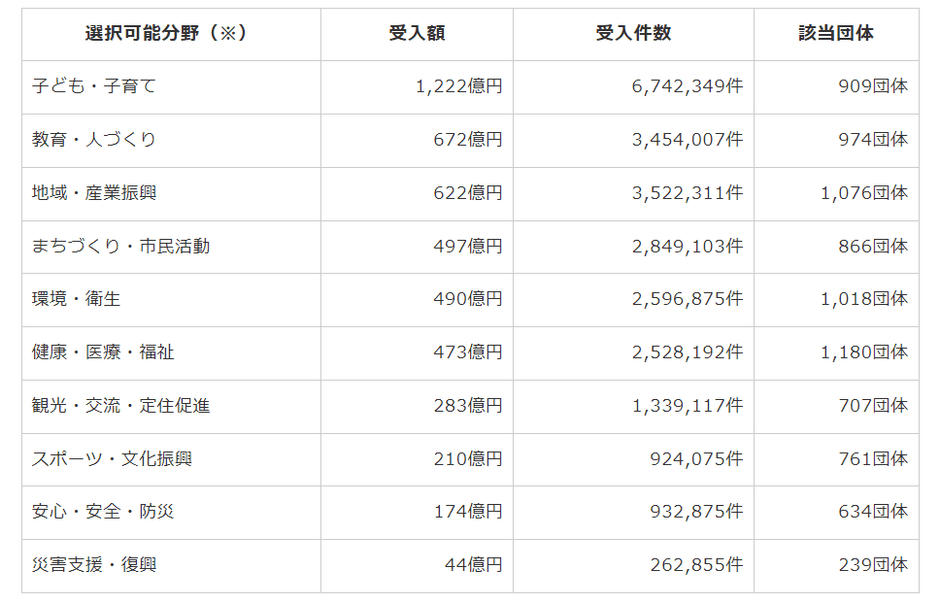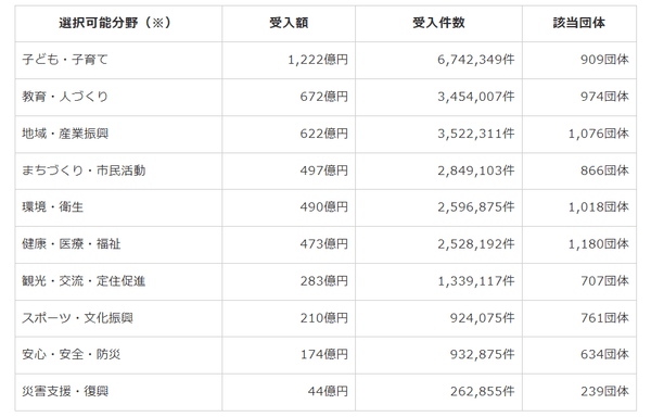 令和5年8月1日に総務省から発表されたデータによると、選択可能な分野ごとの受け入れ額や受け入れ件数は以下の通りです。