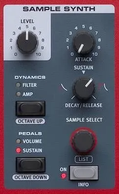 「サンプル・シンセ・セクション」には、Nordウェブサイト(www.nordkeyboards.com)上のNord Sample Library 3.0から独占的にライセンスを受けたMellotron(メロトロン)やChamberlin(チャンベリン)を含む高音質なサウンドを豊富に収録しています。サウンドは、無償のアプリケーションNord Sound Manager(Mac/Win)を使用して、演奏するジャンルや曲調に合わせて自由に入れ替えることが可能で、アタック、ディケイ/リリース、ダイナミクス(フィルター/ベロシティ)のパラメーターのコントロールもできます。