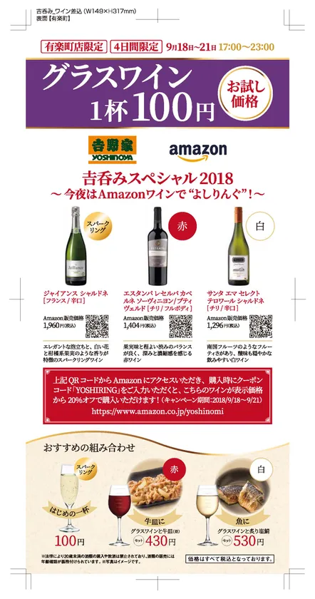 株式会社吉野家(本社:東京都中央区:以下吉野家)は、Amazon(所在地:東京都目黒区)と共同で、Amazon直輸入による高品質なワインを、吉野家が展開する「吉呑み」において1杯100円でご提供する4日間限定イベント『吉呑みスペシャル2018』~今夜はAmazonワインで“よしりんぐ”! ~を2018年9月18日(火)から21日(金)まで吉野家有楽町店にて開催いたします。
