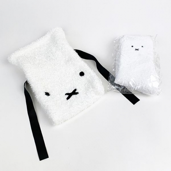 馴染みのお顔デザインがキュートな、ふわふわな巾着です。ブラックのリボンを絞って使ってください。