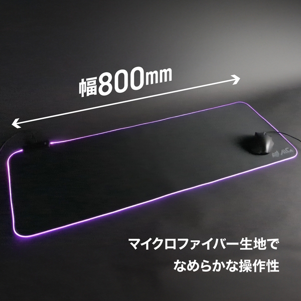 機能:光学式マウス対応。表面マイクロファイバー生地でなめらかな操作性。左上コネクタ部分にあるボタンを押し、色や発光パターンの変更が可能