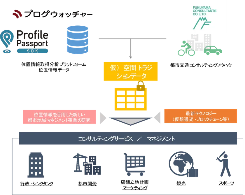 ブログウォッチャーが保有する位置情報に関するデータ取得技術・分析プラットフォームや蓄積した大量の位置情報データに、福山コンサルタントが有する都市計画や交通コンサルティングのノウハウとSVI研究所が研究する仮想通貨やブロックチェーンの最新のテクノロジーを融合させ、人口減少時代における都市・地域の活性化やコミュニティ創出に貢献する位置情報データの活用方法を創出し、新たな都市・地域マネジメント事業を行います。