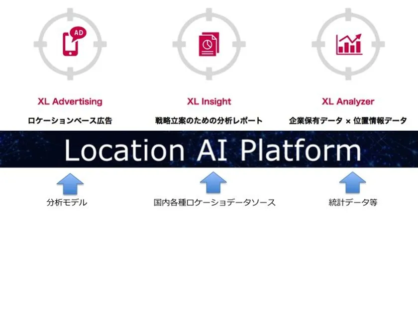 位置情報ビッグデータを活用し、最適なロケーションベース広告※2の配信ができる「XL Advertising」、戦略立案のための分析レポートを提供する「XL Insight」、企業が保有する位置情報データを取り込みプラットフォームが保有するデータと複合して分析ができる「XL Analyzer」の3つの機能を持っています。