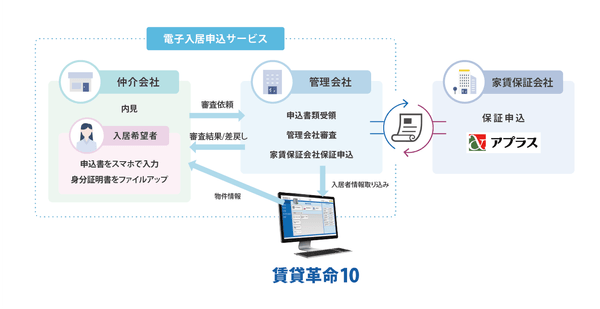 入居申込をオンラインで完結する日本情報クリエイトの「電子入居申込サービス」とアプラスが提携を行うことにより、家賃保証サービスをご利用いただく入居希望者様、仲介会社様、管理会社様はこれまでと比較して、手書きでの保証申込書作成の手間や記載漏れの確認などのストレスが少ない、スムーズな保証申込が可能となります。